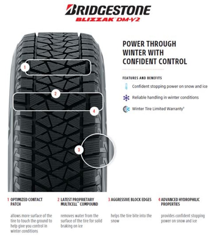 The Bridgestone Blizzak DM V2 is a Premium Touring studless Winter tyre with directional tread, designed for SUV and 4×4.