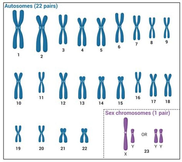 Humans have 23 pairs of chromosomes–22 pairs of numbered chromosomes, called autosomes, and one pair of sex chromosomes, X and Y. Each parent contributes one chromosome to each pair so that offspring get half of their chromosomes from their mother and half from their father.