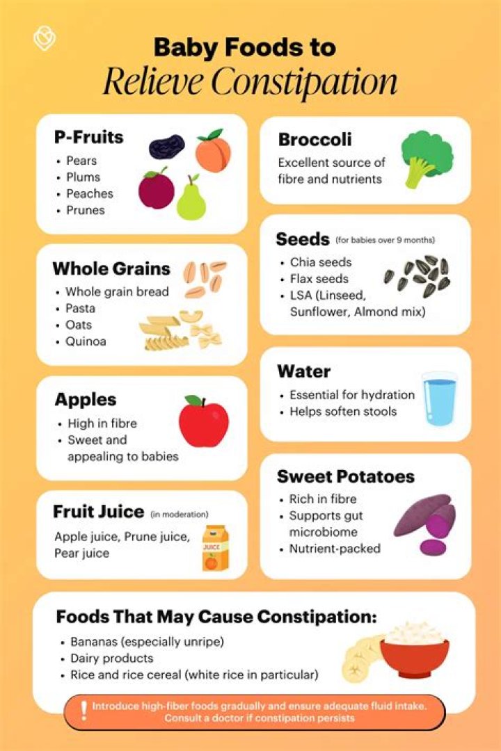 What Should I Know About My Infant’s Diet? *Baby food low in fiber and high in starches, which may worsen constipation, include carrots, sweet potatoes, squash, bananas, applesauce, and rice cereal. You do not need to avoid these foods, but rather avoid pairing them at a meal.