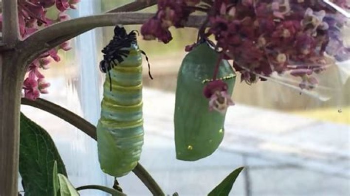 In just 9 to 14 days the transformation from caterpillar to butterfly is complete. Through the chrysalis, the day before the adult emerges, you can see the orange and black wings of the Monarch butterfly inside.