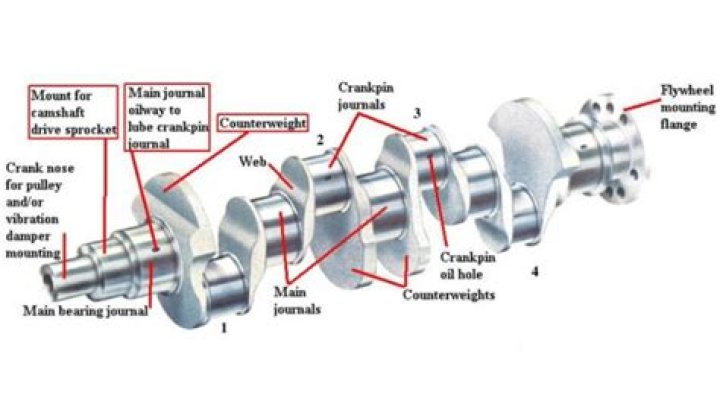 The best and most sure method for recognizing a forged crank is to look for the parting lines on the counterweights. A forged piece will have a wide, irregular rough patch. A cast component (shown) will have a very sharp, well-defined line where the mold was separated.