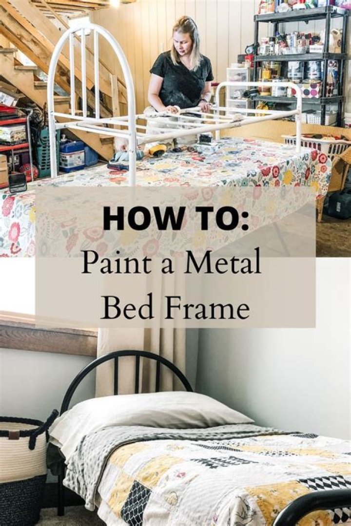 Painting Process The best way to paint your bed frame is with a spray can. … Just make sure the paint is suitable for metal surfaces. You will also need a metal primer spray can too. When paining paint one side at a time, allowing the each coat to dry before turning over your bed frame to pain the other side.