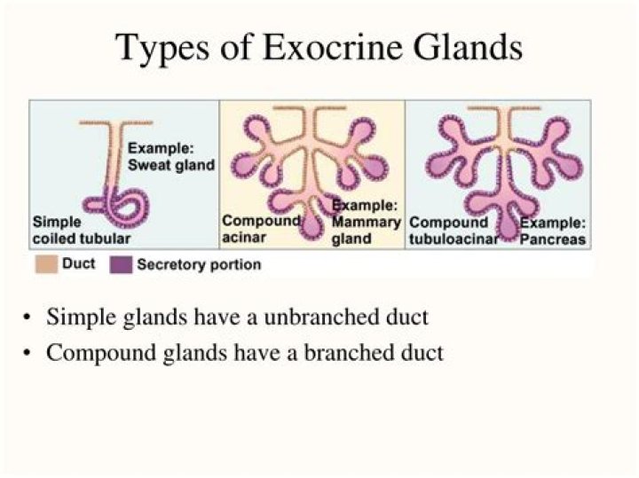 Exocrine glands secrete onto a surface and possess ‘ducts’ lined with epithelium; they can either be simple or compound. Simple glands – these have a single, unbranched duct. Examples include sebaceous glands, intestinal crypts and uterine glands. Compound glands – these have multiple, branched ducts.