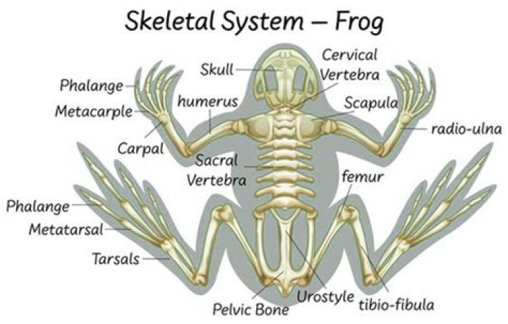 The skeleton of the frog consists chiefly of bony and cartilaginous elements. The functions of a skeleton include providing support for the body, protection of delicate internal organs and attachment surfaces for muscles.