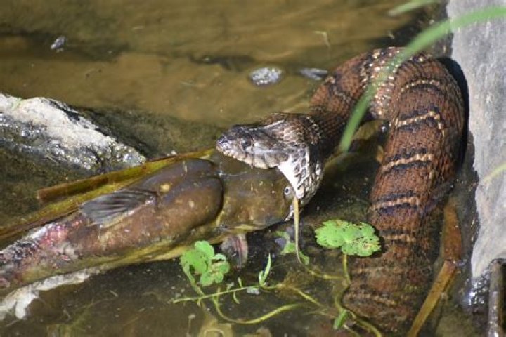 Head shape can also be a telling clue. While cottonmouths have thick, block-shaped heads, a water snake’s head is flat or slender, the University of Florida reports. Cottonmouths will also have an eye stripe on their heads, while northern water snakes do not always have this stripe.