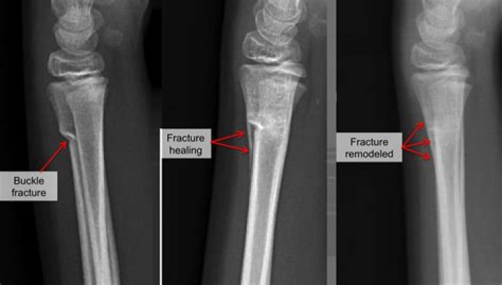 For example, a simple buckle fracture will need a plaster cast for 2 to 3 weeks and be almost completely healed in 4 weeks. Children heal in about half the time it takes an adult to heal from a similar injury.