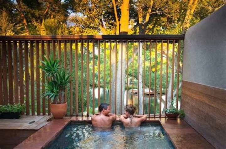 It is a large free-form polished concrete and rock bath that is between 104-106 degrees. Waves is a premium private hot springs pool. The hot springs is 12 foot by 12 foot outdoor hot tub the tempature between 104-106 degrees.