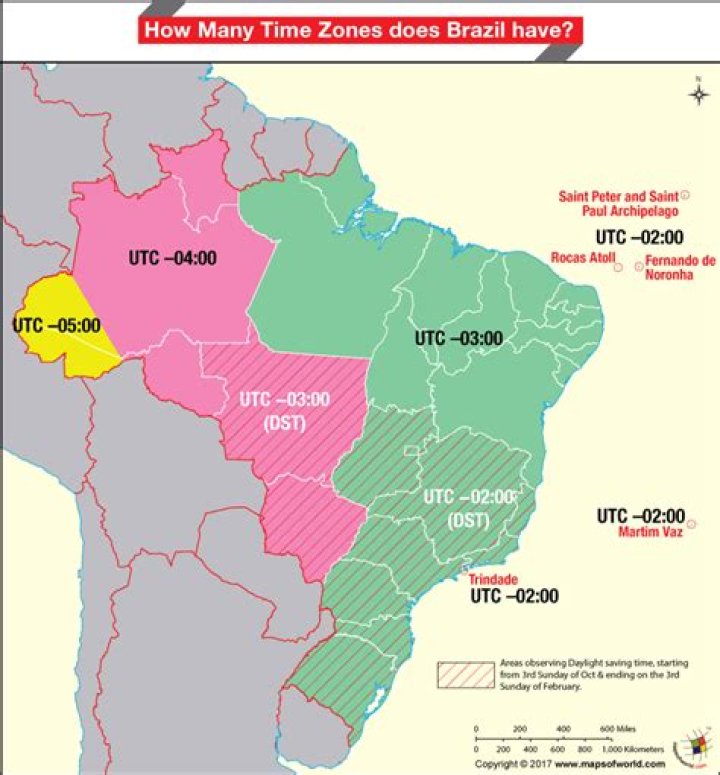 Due to Brazil’s large geographic size, it was split into four time zones. While most of the nation was two, three or four hours behind UTC, most of the western states such as Acre were four hours behind. … States that observe the daylight saving schedule may also change from year to year.