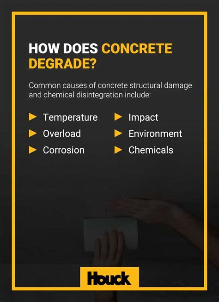 Concrete can be damaged by fire, aggregate expansion, sea water effects, bacterial corrosion, calcium leaching, physical damage and chemical damage (from carbonatation, chlorides, sulfates and non-distilled water).How long does it take concrete to erode?