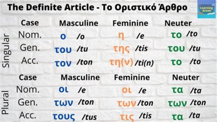 The definite article we use in English is the word ‘the’ and its the only one we have. Ancient Greek has three genders: masculine, feminine, and neuter. The definite article will change accordingly. … The definite article may also not be used in the same grammatical way that it is in modern languages.
