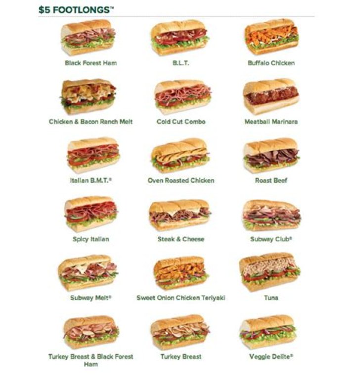What subs are on the $5 footlong menu at Subway?