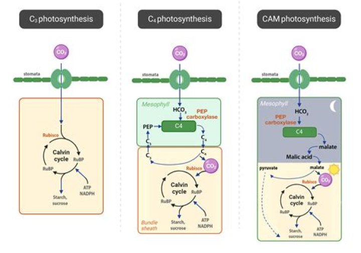 CAM photosynthesis is a CO2-concentrating mechanism that uses a C4 cycle of PEP carboxylation followed by C4 acid decarboxylation to concentrate CO2 around Rubisco (Figure 4). In CAM plants, stomata open at night when conditions are relatively cool and humid.