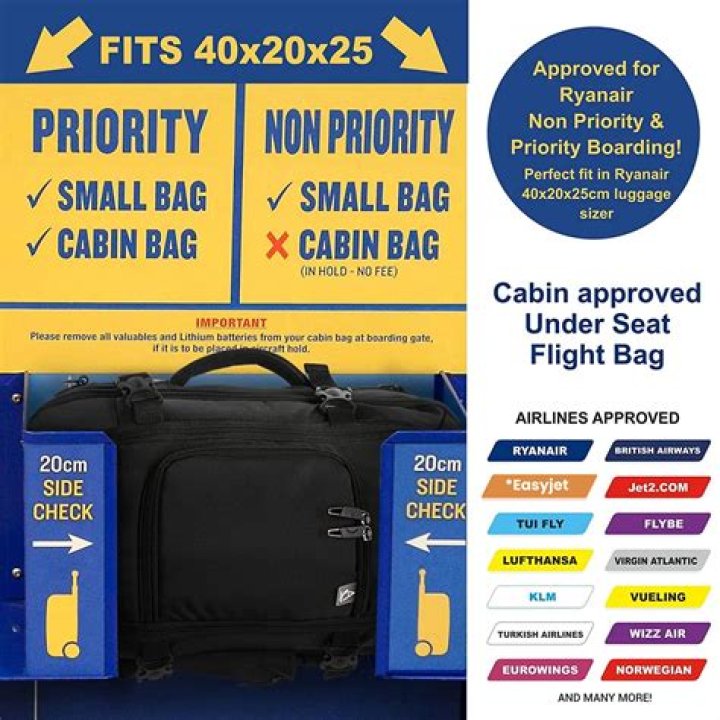 Priority & 2 Cabin Bags gives customers the benefit of boarding the plane via the Priority Queue and carrying their small personal bag (40x20x25cm) and 10kg wheelie bag (55x40x20cm) with them on board. This will mean you won’t need to wait for your bag at the terminal at the destination.How strict is Ryanair with backpacks?