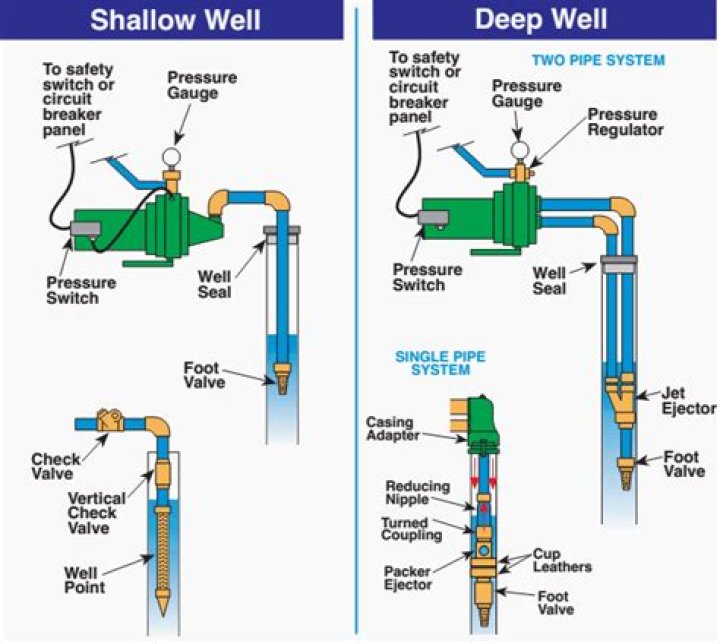 The shallow well jet pumps draw water from one line situated in wells no deeper than a maximum of 25 feet deep. Deep well jet pumps use two lines, one for pulling the water, and one for pushing the water into the delivery system. Deep well jet pumps can pump water from wells that range from 25 to 110 feet deep.