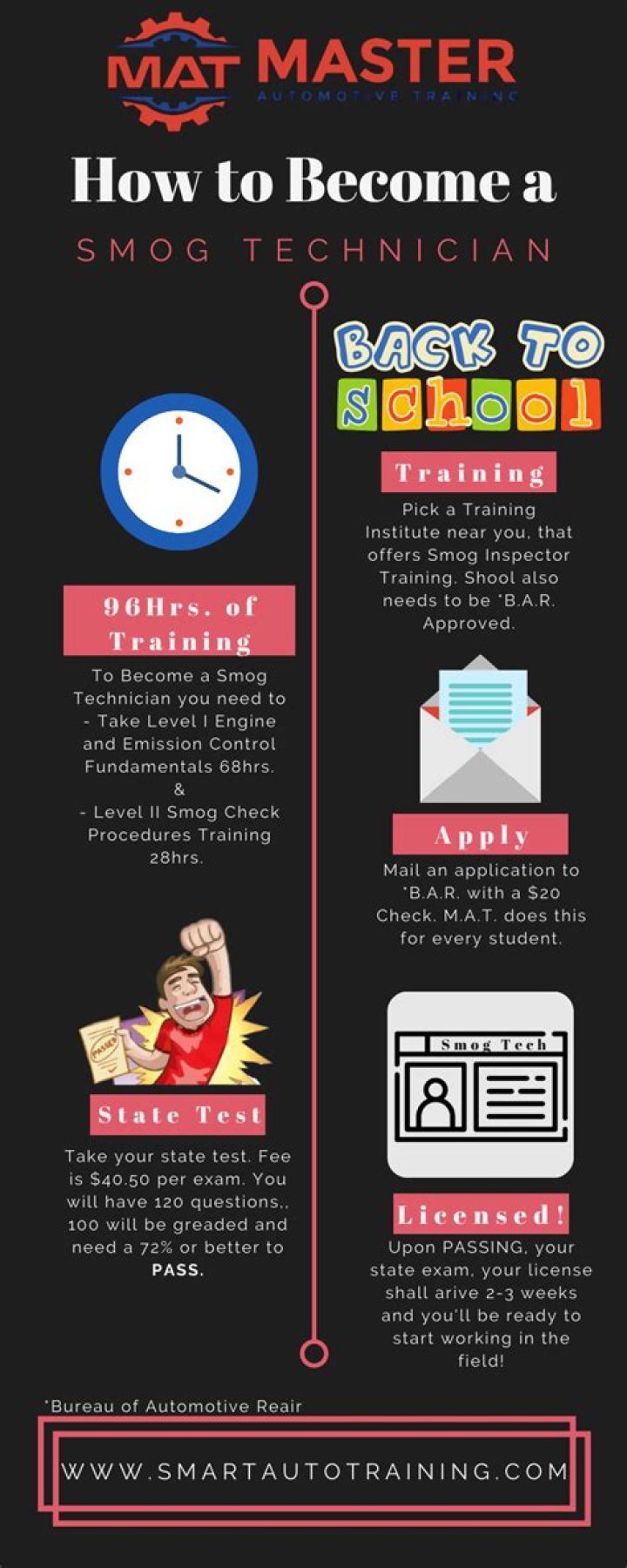 In order to become a smog check technician, the state of California requires you complete a minimum of 96 hours of education. You have to take the Level I Engine and Emission Control Fundamentals course.