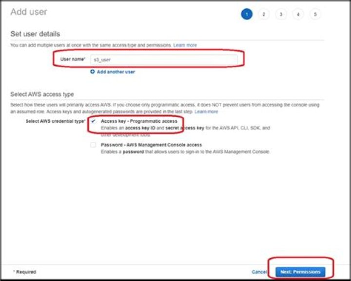Navigate to S3 and create a bucket. … Navigate to IAM.Create a User with Programmatic access.Click Next: Permissions.Click the Attach existing policies directly box and Create policy.Use the visual editor to select the S3 Service.