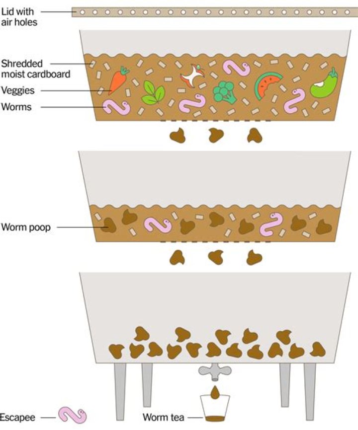Make sure to only feed your worms fresh scraps, cut the food into very small pieces to help the worms eat faster, feed a wide variety of food and keep the worm bin moist, but not wet. Layering a sheet of newspaper on top of your worms’ bedding will keep the flies out of the bin.