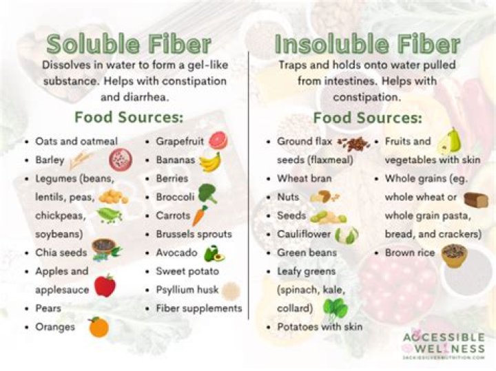 Foods that are good sources of soluble fiber include apples, bananas, barley, oats, and beans. Insoluble fiber helps speed up the transit of food in the digestive tract and helps prevent constipation. Good sources of insoluble fiber include whole grains, most vegetables, wheat bran, and legumes.