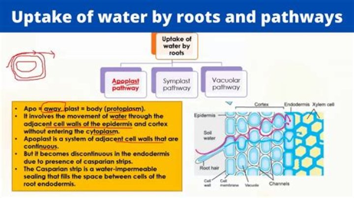Water moves by osmosis from the soil solution into the root hair cells down a water potential gradient either along the symplastic patway or the apoplastic pathway. >Water is drawn into the endodermis cells. > Pulls more water along behind it due to cohesive properties of water molecules.