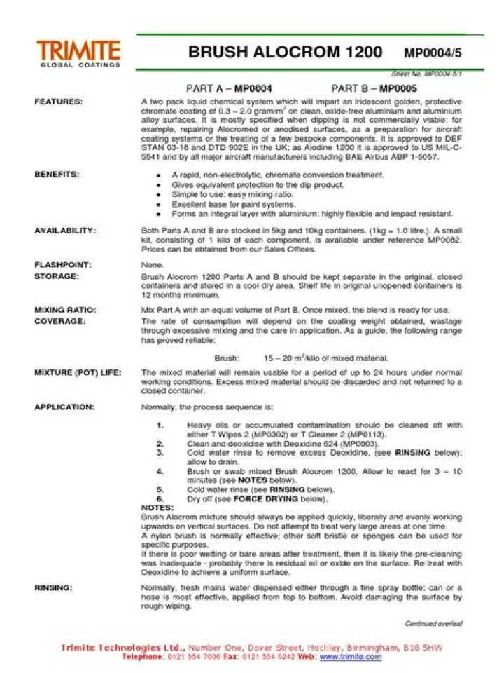 What is alocrom1200?ALOCROM 1200 is a rapid non-electrolytic dip process which forms a protective iridescent golden coloured chromate coating on aluminium and its alloys. It gives excellent corrosion resistance to painted and unpainted aluminium surfaces.