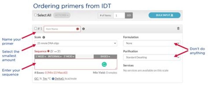 This can usually be found on the tube itself or the primer sheet supplied with the order. For every 1 nmoles, add 10 μL of PCR-grade water. For example, if a primer states 19.4 nmoles, then add 194 μL of PCR-grade water. Mix the solution by vortexing to reconstitute the primers.