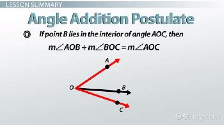 The angle addition postulate states that if B is in the interior of AOC , then. m∠AOB+m∠BOC=m∠AOC. That is, the measure of the larger angle is the sum of the measures of the two smaller ones.