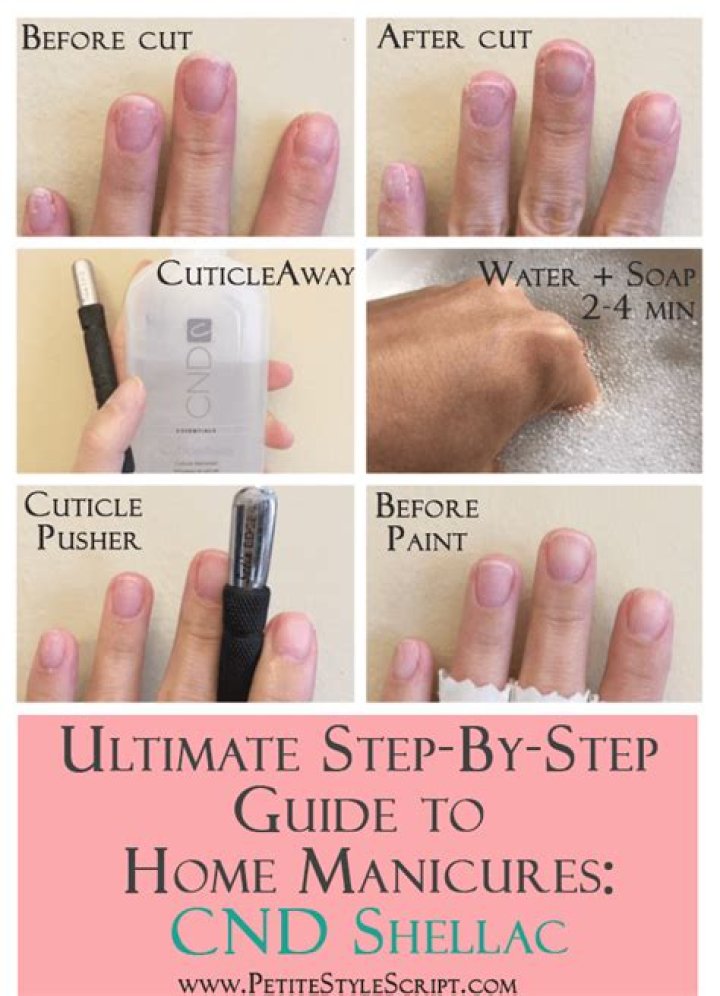 Care for Your Cuticles.Shape the Nails.Time to Paint Your Shellac Nails! Apply a Base Coat. Apply Two Layers of Colour Gel Polish. Apply Top Coat.Apply Cuticle Oil and Hand Cream.