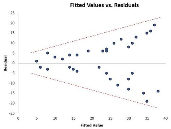 Heteroscedasticity produces a distinctive fan or cone shape in residual plots. … Typically, the telltale pattern for heteroscedasticity is that as the fitted values increases, the variance of the residuals also increases. You can see an example of this cone shaped pattern in the residuals by fitted value plot below.