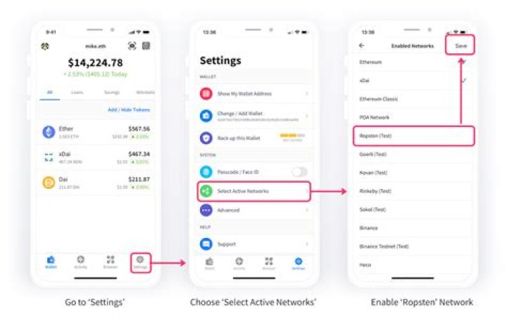 In AlphaWallet, go to ‘Settings“, then ‘Select Active Networks’ and select ‘Ropsten (test)’. Click ‘Save’ and you are ready to go. Then you can get Ropsten ETH through below faucets: