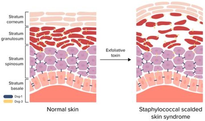 In SSSS the toxin spreads to the skin through the blood stream and specifically binds to a target protein very high in the epidermis (outer layer of the skin) producing total body reddening of the skin and blistering and sloughing of the skin resembling a hot water burn or scalding of the skin.How do you get scalded skin?
