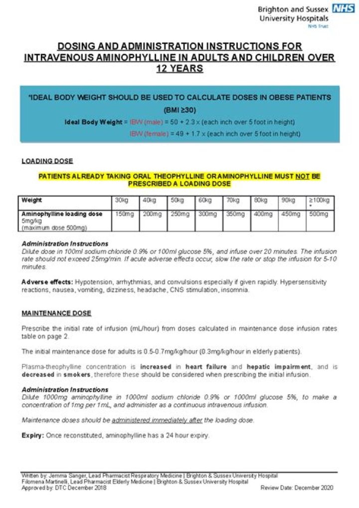 If aminophylline is given intravenously, a blood sample should be taken 4–6 hours after starting treatment. Plasma-theophylline concentration is measured 5 days after starting oral treatment and at least 3 days after any dose adjustment.