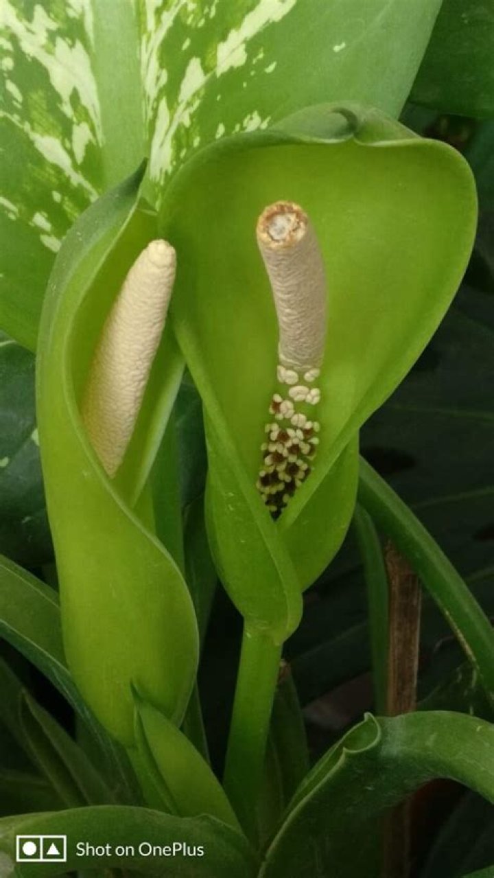 There are a variety of cultivars available, most with variegated white and green, cream and green, or all-green leaves that can be speckled, splotched, or loosely striped. Primarily grown for foliage, dieffenbachia rarely flowers, but when it does, the bloom looks a bit like a peace lily.