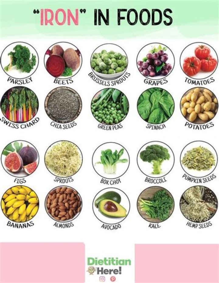 Red meat, pork and poultry.Seafood.Beans.Dark green leafy vegetables, such as spinach.Dried fruit, such as raisins and apricots.Iron-fortified cereals, breads and pastas.Peas.
