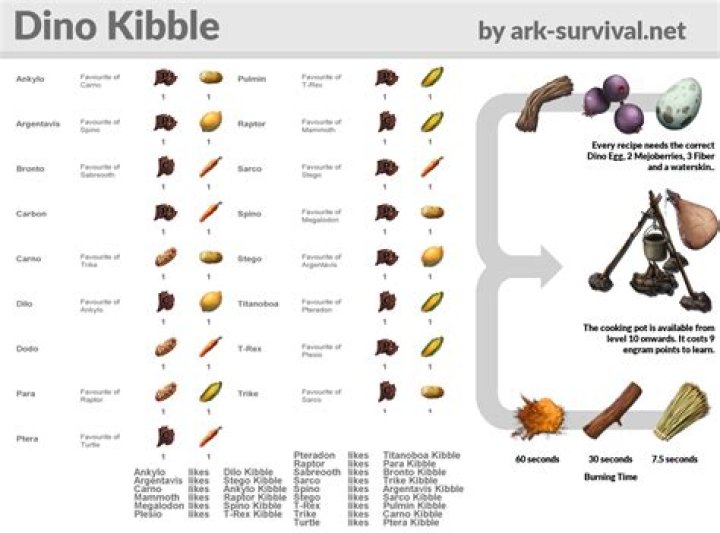 Cooking these kibbles requires a lit Cooking Pot so in addition you need fuel for the fire. It takes 30 seconds to cook 1 kibble in a Cooking Pot. See also Egg for a list of eggs and their size.