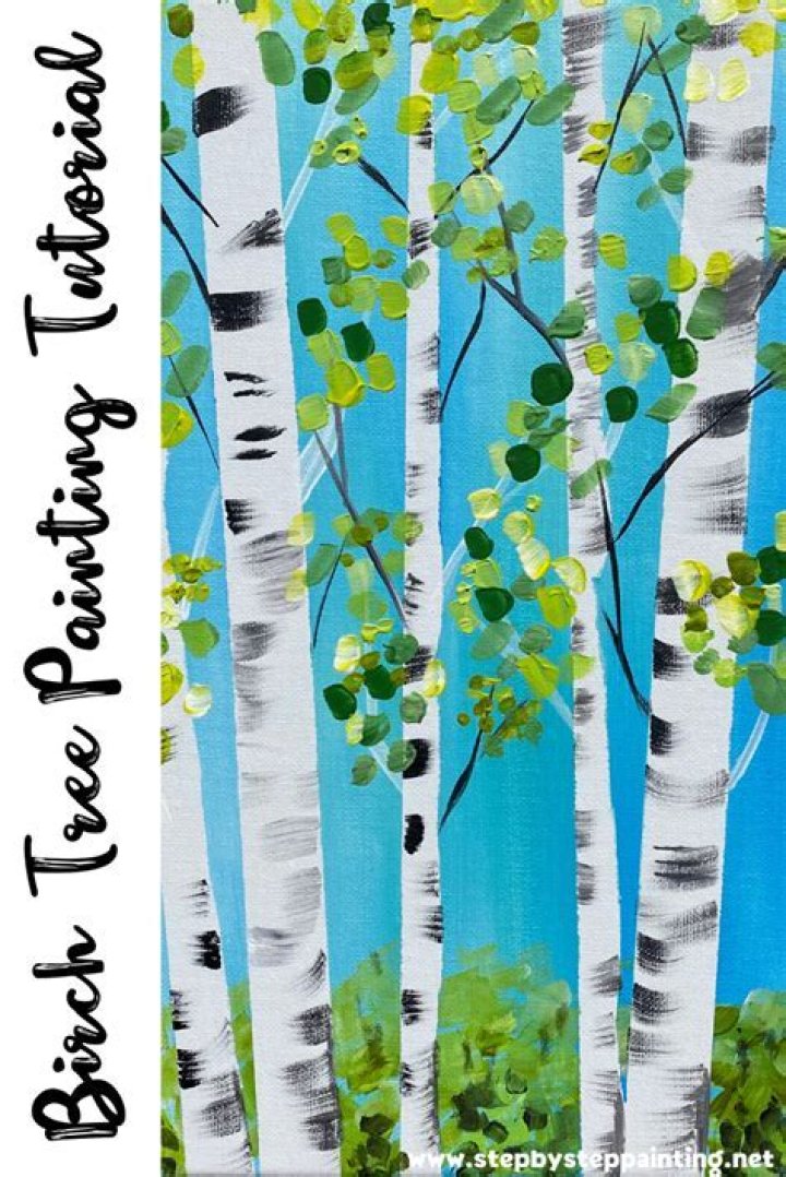 Use an old gift card and dip the side in black paint. Then drag it on the trees to make the marks. Use a 12 Bright and do some dry brush strokes on the trees as well. Use titanium white to paint branches on the birch trees.