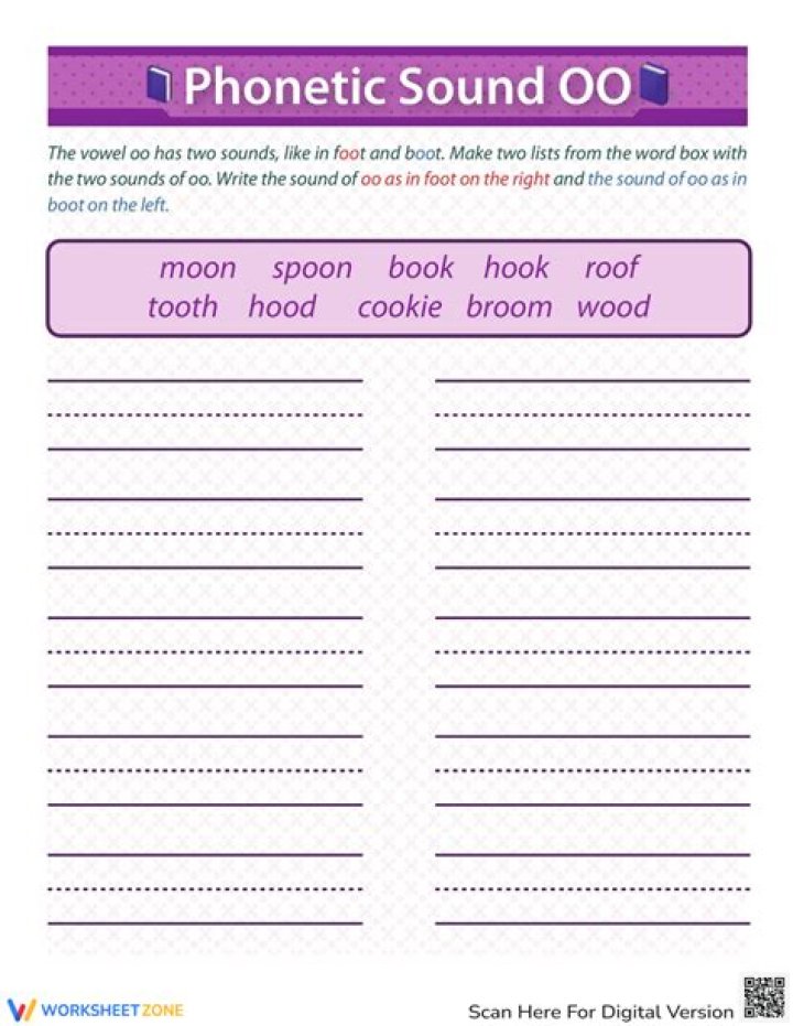 For example ‘oo’ can have a short vowel sound (‘oo’ as in wood) or a long vowel sound (‘oo’ as in mood). These words contain the short and long ‘oo’ sound. … Discuss the meaning of the words and try to think of a sentence containing the word.