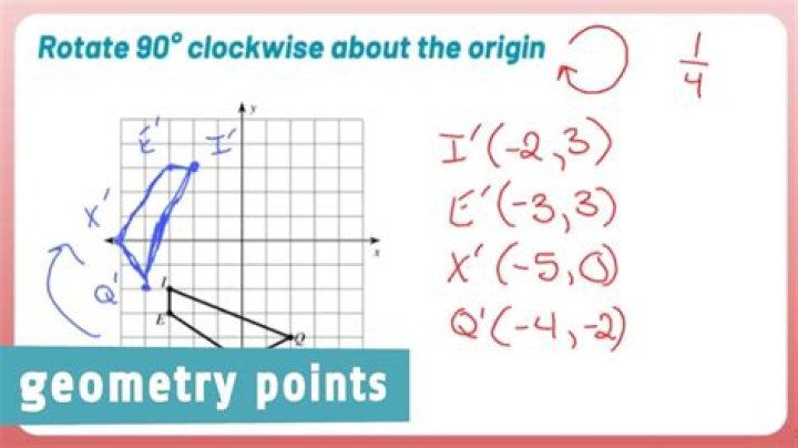 - When rotating a shape by 90 degrees about the origin, each point (x,y) becomes (-y,x)