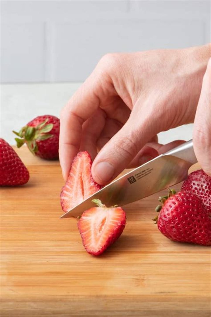 The fastest way to hull strawberries is with your go-to paring knife. All you have to do is lay your strawberries on the cutting board and slice off the top of the berry. That’s it! This method is quick, so it works well for when you have to prep a lot of berries, like for homemade jam or multiple pies.