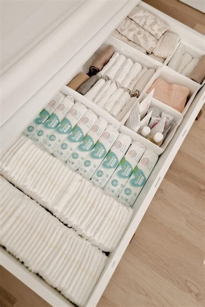 Use drawer dividers. Separate baby clothes by type and fold them into their own individual drawer divider. Drawer dividers will help you maximize the space in each drawer and will help maintain an organized dresser.