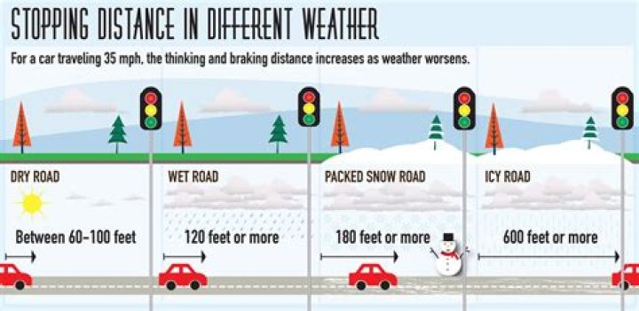 Accelerate and decelerate slowly. Don’t try to get moving in a hurry and take time to slow down for a stoplight. Remember: It takes longer to slow down on icy roads. Increase your following distance to five to six seconds. This increased margin of safety will provide the longer distance needed if you have to stop.