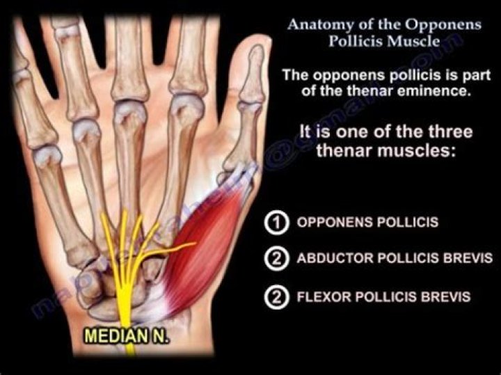 As its name suggests, the main function of opponens pollicis is to produce an opposition of the thumb. Opposition refers to the rather complex movement of the thumb which is a combination of flexion, adduction and medial rotation at the first carpometacarpal joint.
