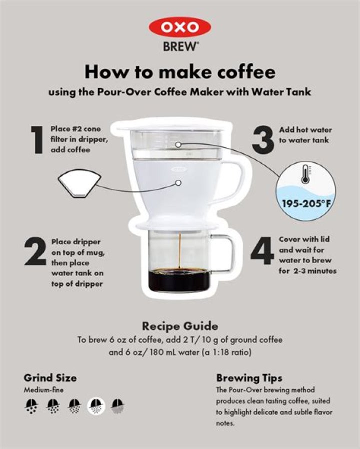 You’ll Need We use 1.6–2 grams of coffee per fluid ounce of water; our recipe makes approximately 17 ounces (500 grams) of brewed coffee. *Do not fill the dripper or brew basket more than 1/2–1/3 full of ground coffee to ensure appropriate coffee/water contact. Total brew time should be 3–4 minutes.
