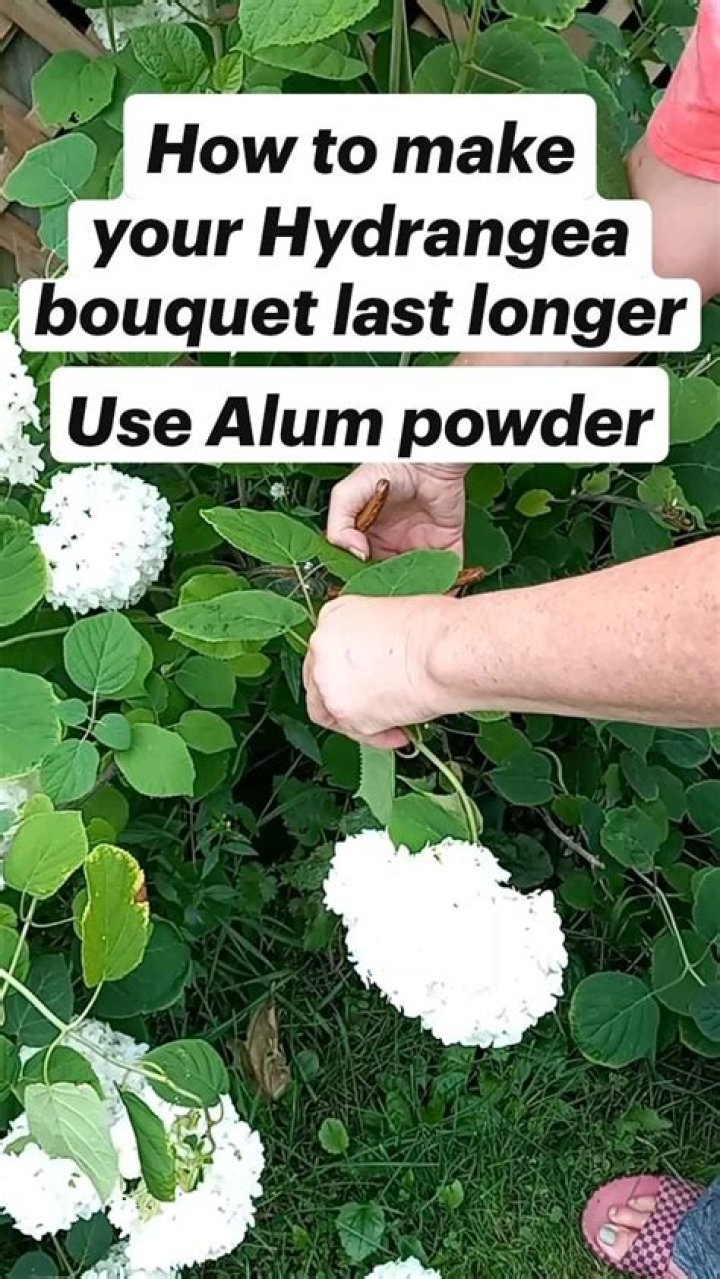 Alum can be found in the spice or baking aisle of most grocery stores. After cutting, simply dip a small section of the hydrangea stem into the alum powder before putting the flower in a vase. It is believed that this process will help the flowers with water uptake.