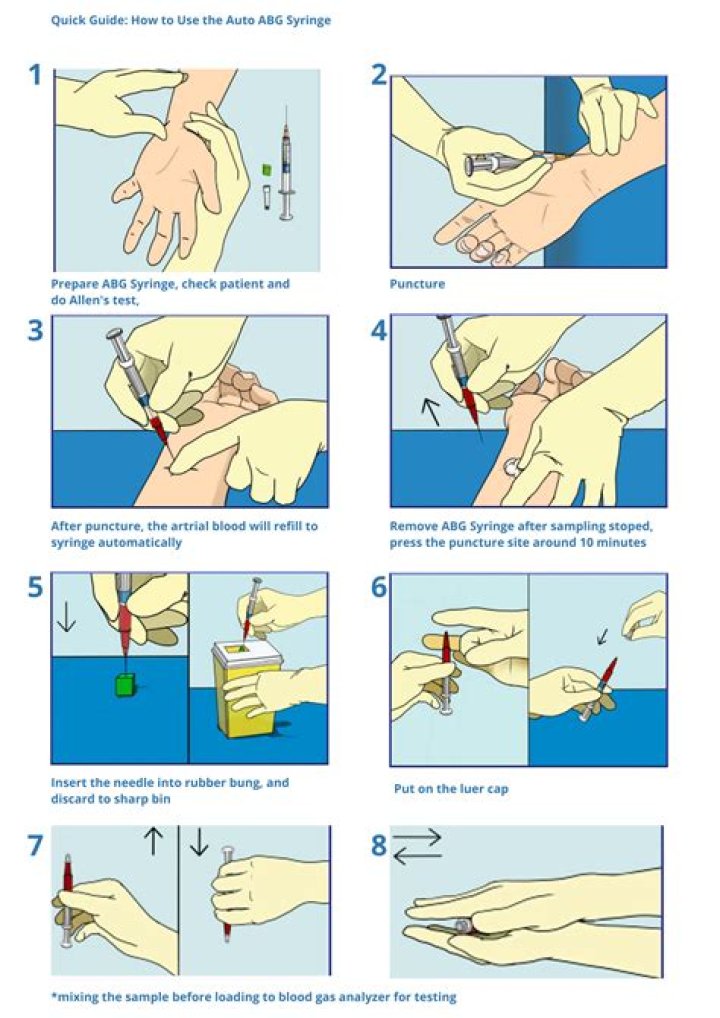 Most ABG samples can be drawn by a respiratory technician or specially trained nurse. Collection from the femoral artery, however, is usually performed by a doctor. Before attempting a radial puncture, you should perform Allen’s test.
