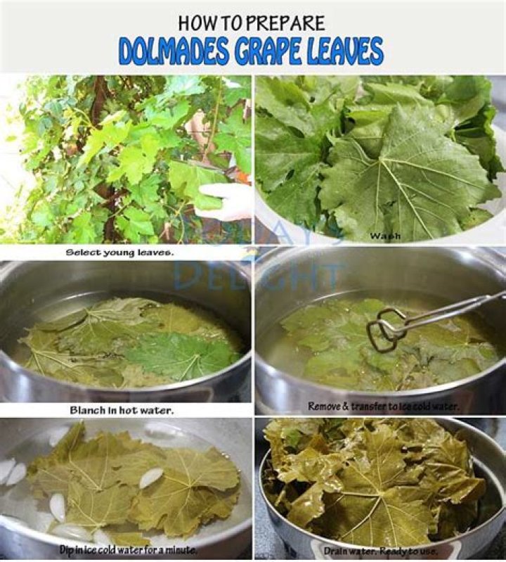 Either soak in very hot water for 15 minutes to soften the leaves or blanch grape leaves in a brine until they are soft (the time will depend on the leaves – fresh ones will only take a minute). Bring water to and boil. Add grape leave, approximately 12 leave at a time.