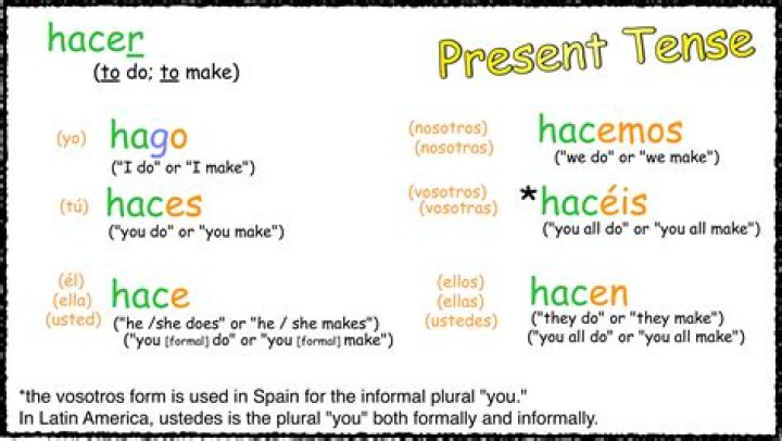 ConjugationTranslationyo hagoI dotú hacesYou (informal) doél/ella/ello/uno haceHe/she/one doesusted haceYou (formal) do