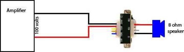 Attached to each speaker in a 70V system is another transformer that changes the power back to “lower voltage/higher current” so that it can drive the 8-ohm speaker. These transformers usually have two output taps, one for 8-ohm speakers, and one for 4-ohm speakers.