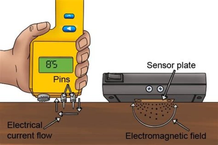 Pin-type moisture meters use the principle of electrical resistance to measure the presence or absence of water in wood, drywall, hay, and other materials. When activated, electrical current travels down one electrode, through the material being tested, and into another electrode.