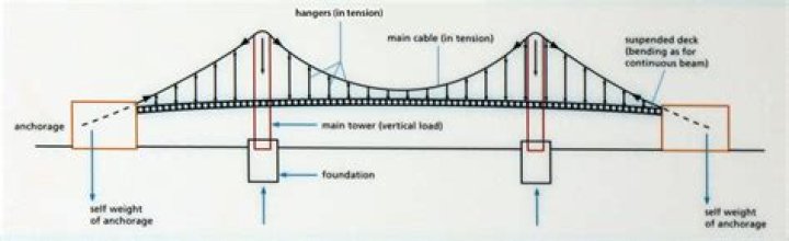 A suspension bridge carries vertical loads through curved cables in tension. These loads are transferred both to the towers, which carry them by vertical compression to the ground, and to the anchorages, which must resist the inward and sometimes vertical pull of the cables.