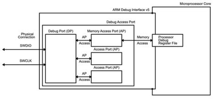 SWD uses an ARM CPU standard bi-directional wire protocol, defined in the ARM Debug Interface v5. This enables the debugger to become another AMBA bus master for access to system memory and peripheral or debug registers. The Debug Access Port (DAP) is split into two main control units.